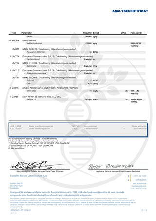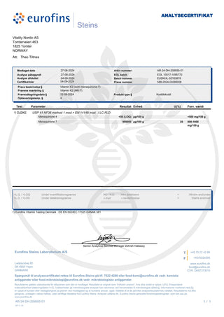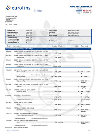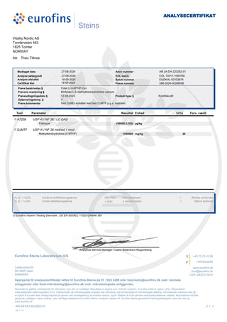 Uavhengig laboratoriekontroll i Danmark:Analysene ble utført på ferdig blandet produkt med de diverse ingrediensene. Analysemetodene er i utgangspunktet ikke optimal for å påvise svært små mengder av enkelte ingredienser i komplekse blandinger, som vi tolket som årsaken til resultatene for vitamin K2 (MK-7) og folat (L-5-MTHF), som ikke er tilfredsstillende. Råmaterialet ble derfor analysert separat i ren form før innblanding, med tilfredsstillende resultater - se egne sertifikater for MK-7 og L-5-MTHF under.